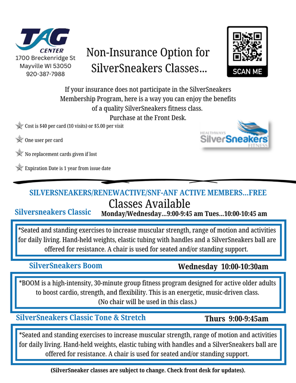 SilverSneakers Boom Class will be on Wednesdays from 10AM - 10:30AM in the blue Room.