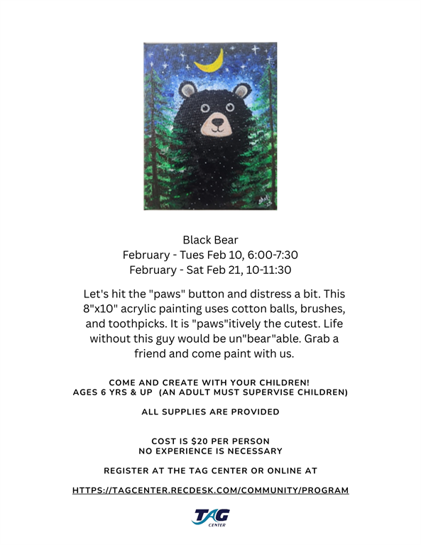 Let's hit the "paws" button and distress a bit. This 8"x10" acrylic painting uses cotton balls, brushes, and toothpicks. It is "paws"itively the cutest. Life without this guy would be un"bear"able. Grab a friend and come paint with us.